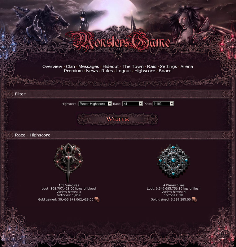 Vampiri e Lupi Mannari possono creare clan in MonstersGame (ovviamente solo mostri della stessa razza possono far parte di clan!). Usando il link "Clan" puoi sia cercare un clan esistente che sta cercando membri sia, una volta raggiunto il livello 3, creare il tuo di clan! Una volta che sei entrato in un clan o che ne hai creato uno, vedrai un menù oggetti quando cliccherai sul link "Clan". Tra questi nuovi link (come admin del clan), potrai accettare nuovi membri, potrai dare ai membri alcune autorizzazioni per il clan, o allontanare membri dal tuo clan. Puoi inoltre estendere il domicilio del clan; ogni livello aggiunto del domicilio del clan aumenta il potenziale numero di membri che il clan può ospitare di 5 in 5. Per migliorare il domicilio avrai bisogno di donazioni di monete da parte dei vari membri del tuo clan.